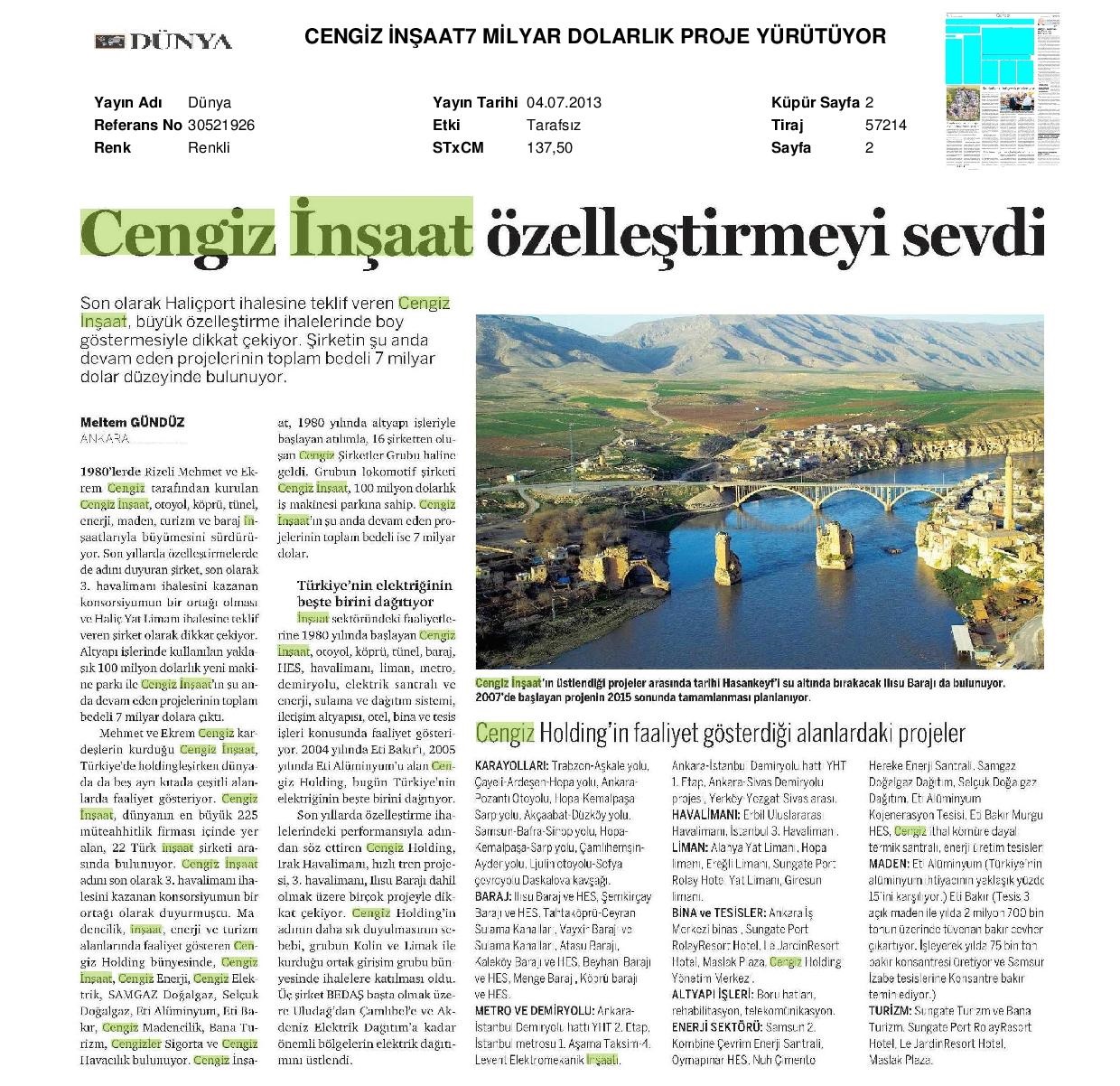 Cengiz İnşaat 7 Milyar Dolarlık Proje Yürütüyor